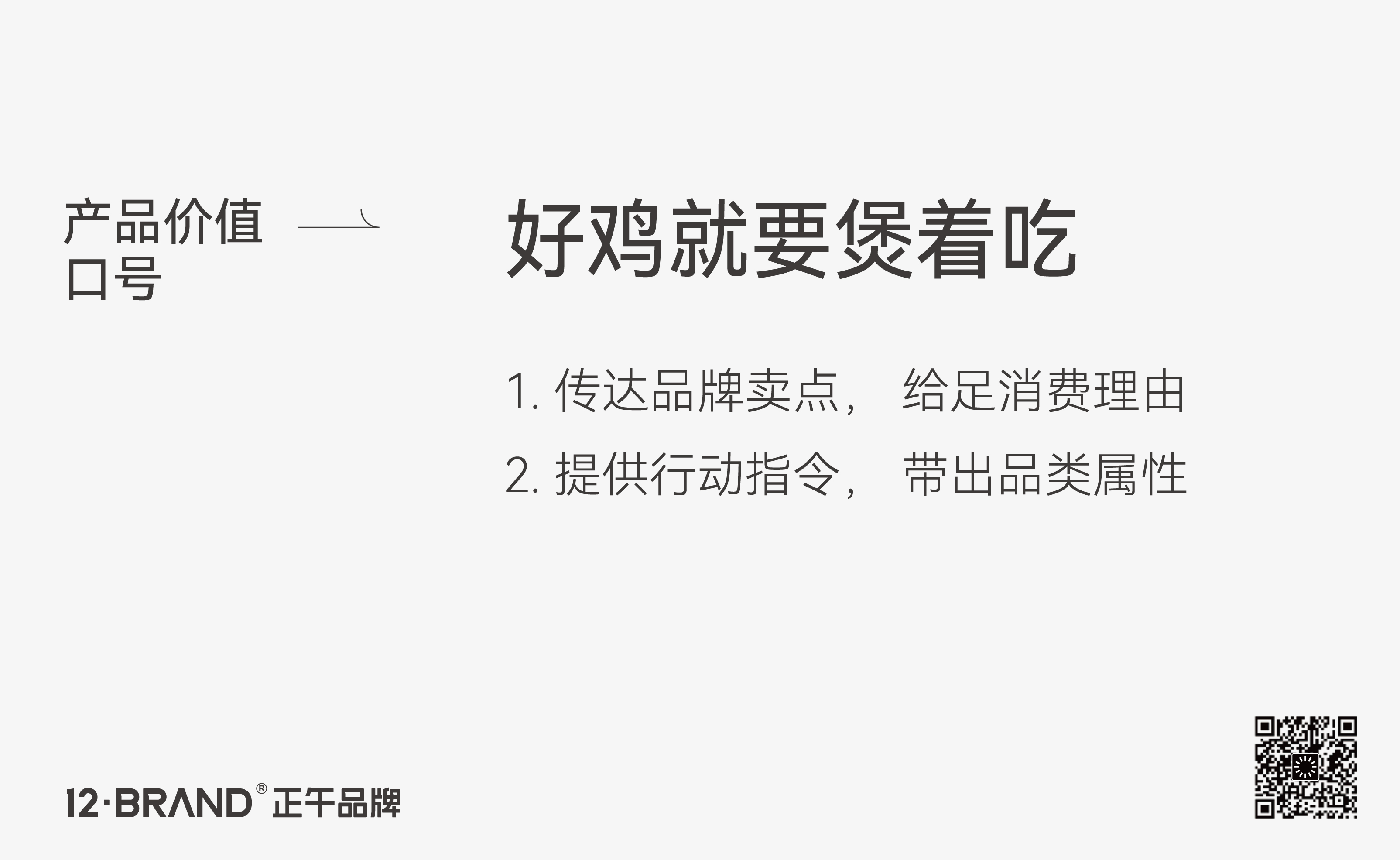 從產(chǎn)品價(jià)值角度,我們建立了品牌口號(hào)——“好雞就要煲著吃”,直接傳達(dá)出產(chǎn)品高價(jià)值賣(mài)點(diǎn),鏈接食欲刺激消費(fèi),即給足消費(fèi)理由,又帶出品類(lèi)屬性。